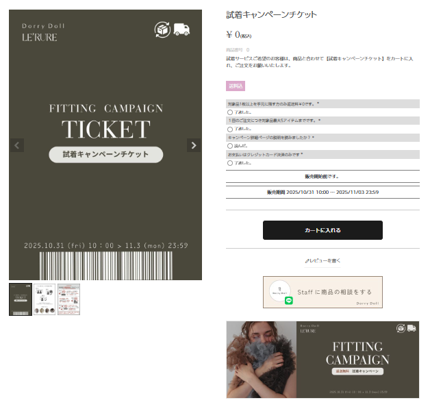 申し訳ございませんが、チケットを入れ忘れてしまった場合、試着キャンペーン対象外とさせていただいております。 予めご了承ください。